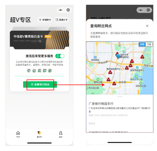 我们围绕的是超V业务,那么用户在申请超V卡后,可能会处于未激活状态,这个时候会提示用户“在线激活”或“查看附近网点”,那么若用户点击查看附近网点,会根据用户的定位,从近到远展示对应银行的线下网点,同时会展示定制化地图,上面会标记对应的银行logo等。