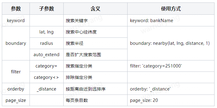 通过对应设置相关属性,能够仅仅使用一次调用,就可以完成基于用户所在位置,自动扩大范围进行地点搜索,返回排序后的结果,同时基于POI分类表,能自动剔除无用信息。
