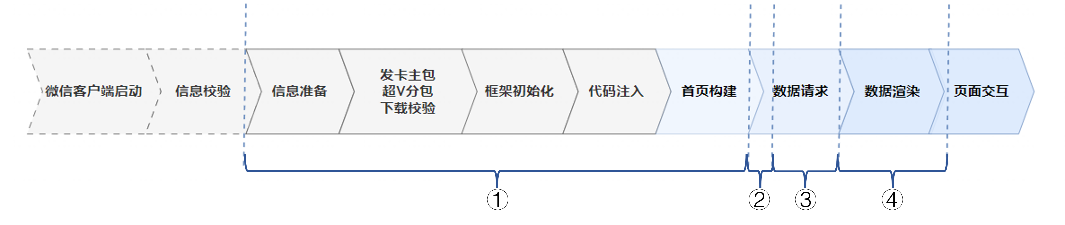 根据整体小程序启动流程的分析,我最终将其分为了四个阶段:冷启动耗时、JS初期的执行耗时、主接口耗时、数据渲染耗时。