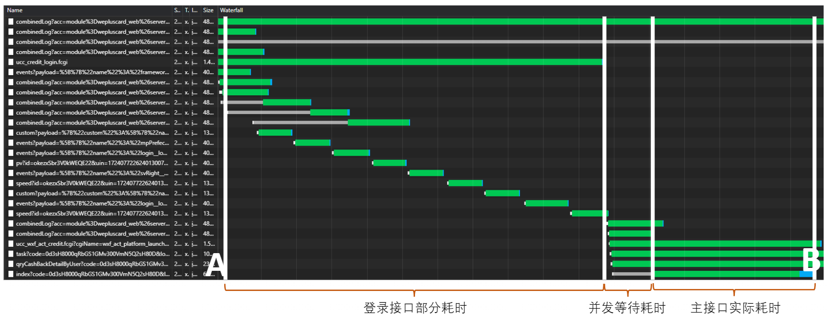 通过nextwork观测,接口耗时为AB这段时间,通过具体接口的分析,发现其分为三个阶段: