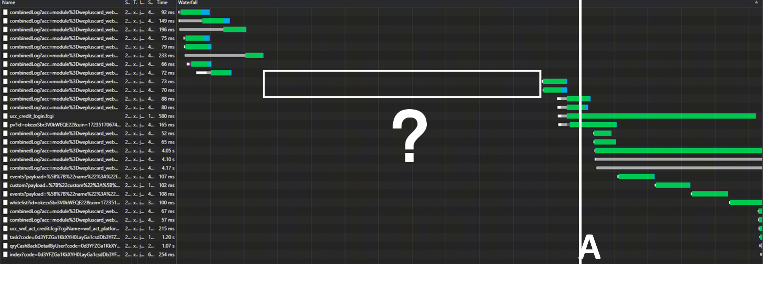 通过开发者工具performance找出接口请求发起的时间点,发现请求前存在大段无请求的真空时间段。